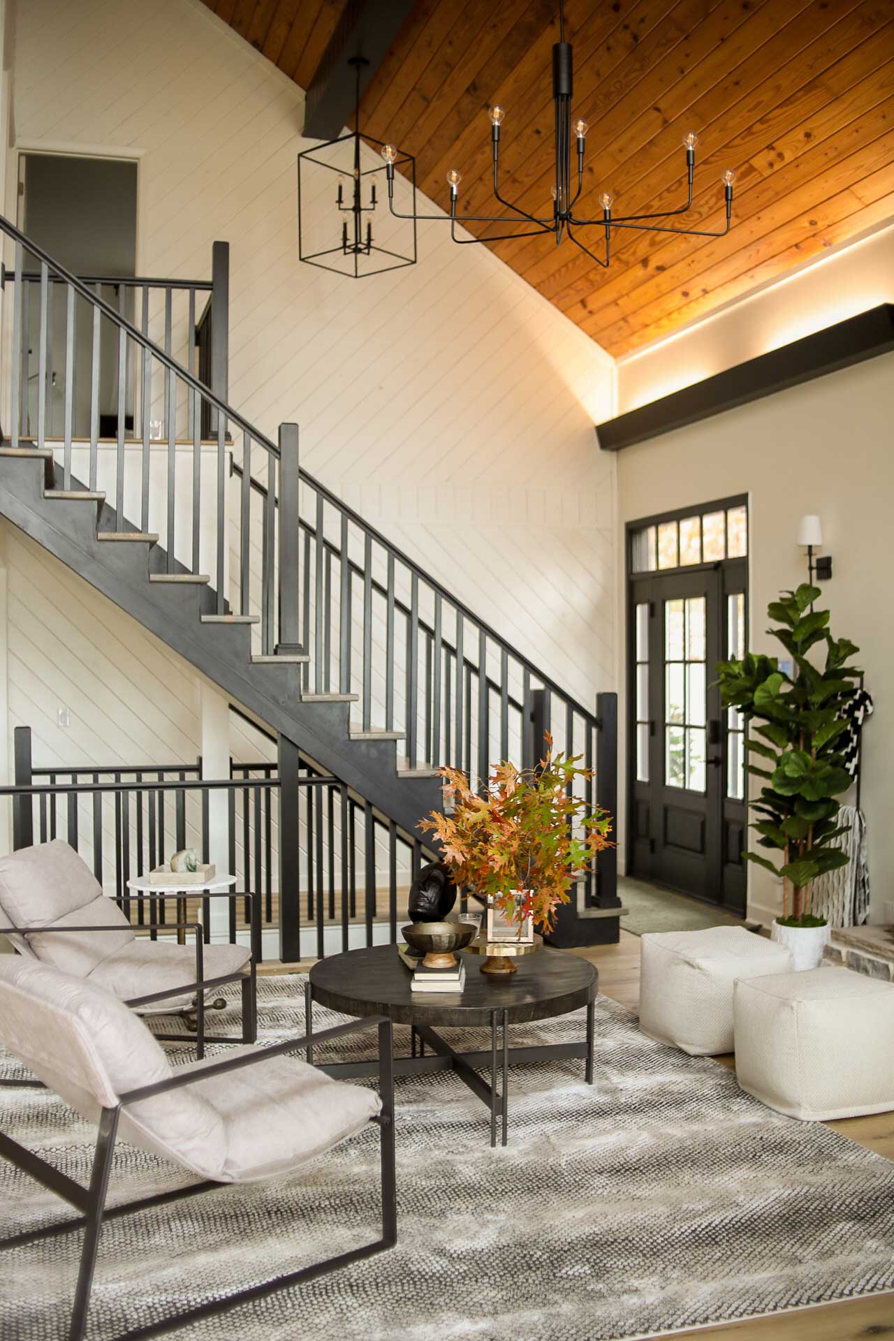 Head downstairs from the living room to find a fully equipped game room with arcades, a foosball table, and a beverage station. Lounge chairs and a smart TV are set up and ready for the big game.